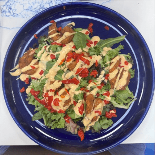 Grilled chicken over lettuce, tomatoes, cucumbers, olives, and onions with balsamic vinaigrette