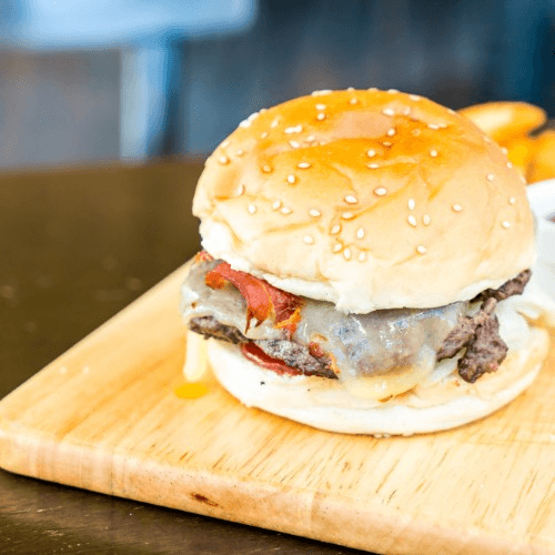 Steak burger 10oz served with bacon, mozzarella cheese, lettuce, tomato & onions with french fries.